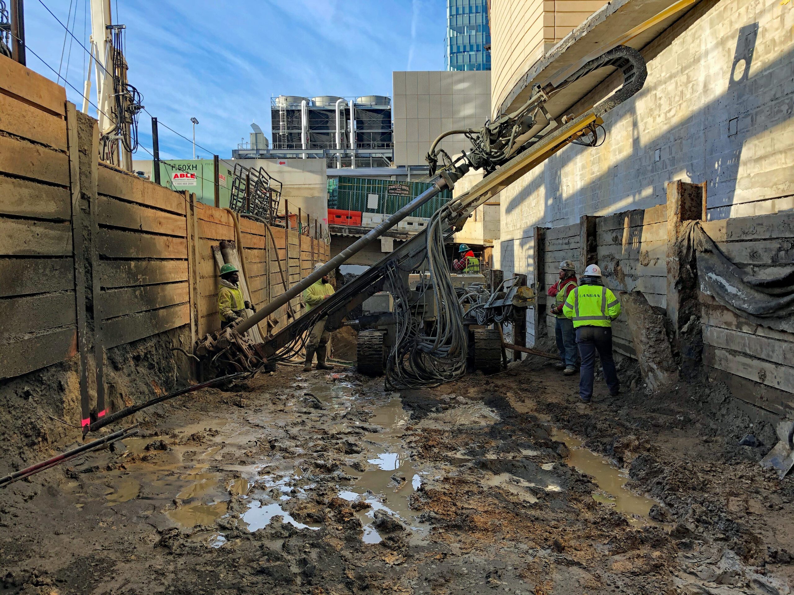 The CHOP PAOB project was located at the corner of East Service Drive and Health Sciences Drive on the last undeveloped parcel at the old convention center site. The project was surrounded by existing buildings on the north and west and by Health Sciences Drive on the south and East Service Drive on the east side. The site was also dissected by an access ramp to the existing parking garage. With excavations reaching a maximum depth of 60′ below grade, this was one of the deepest excavations ever undertaken in the City of Philadelphia in an extremely small footprint. This project also had the two main ingredients of a difficult excavation, rock and groundwater. Rock was typically encountered at 20′ below grade and groundwater was typically encountered at 35′ below grade. Our crews excavated over 20,000 cubic yards of rock, installed 70 temporary tieback anchors, 52 permanent tieback anchors, 100 soil nails and 55 rock bolts. They also installed 6400 SF of temporary shotcrete wall and 9500 SF of permanent shotcrete wall. This project highlighted our ability to handle a deep and difficult excavation with rock and ground water using all of our excavation support capabilities.